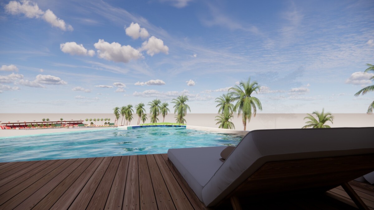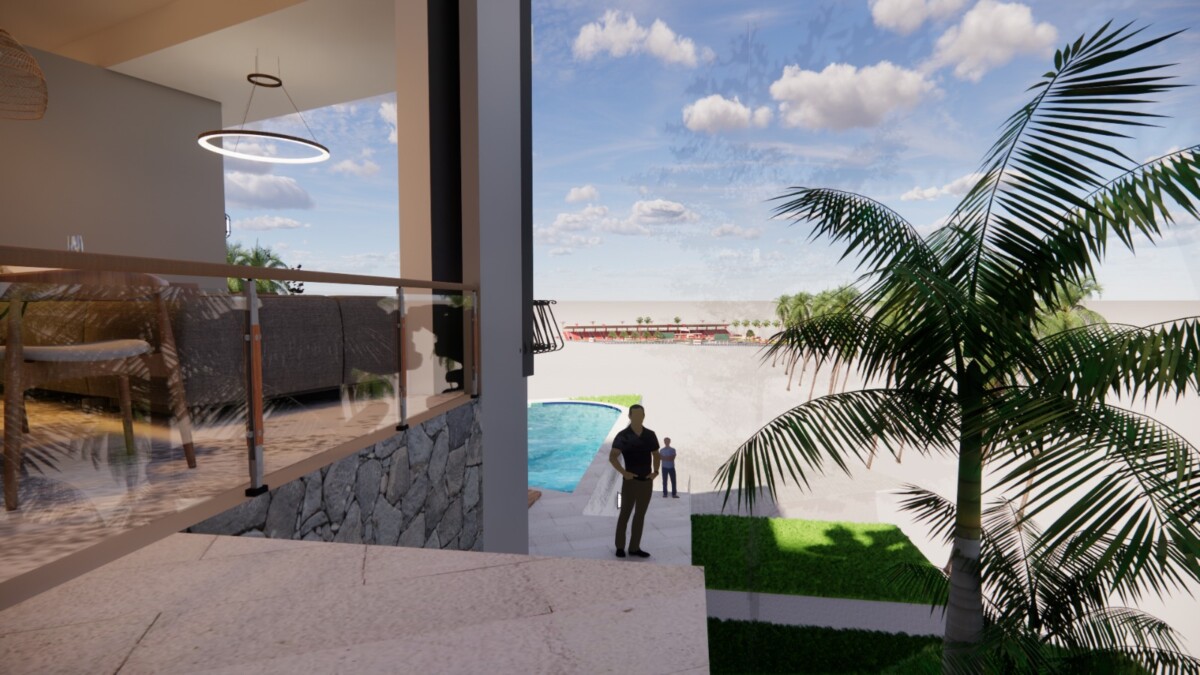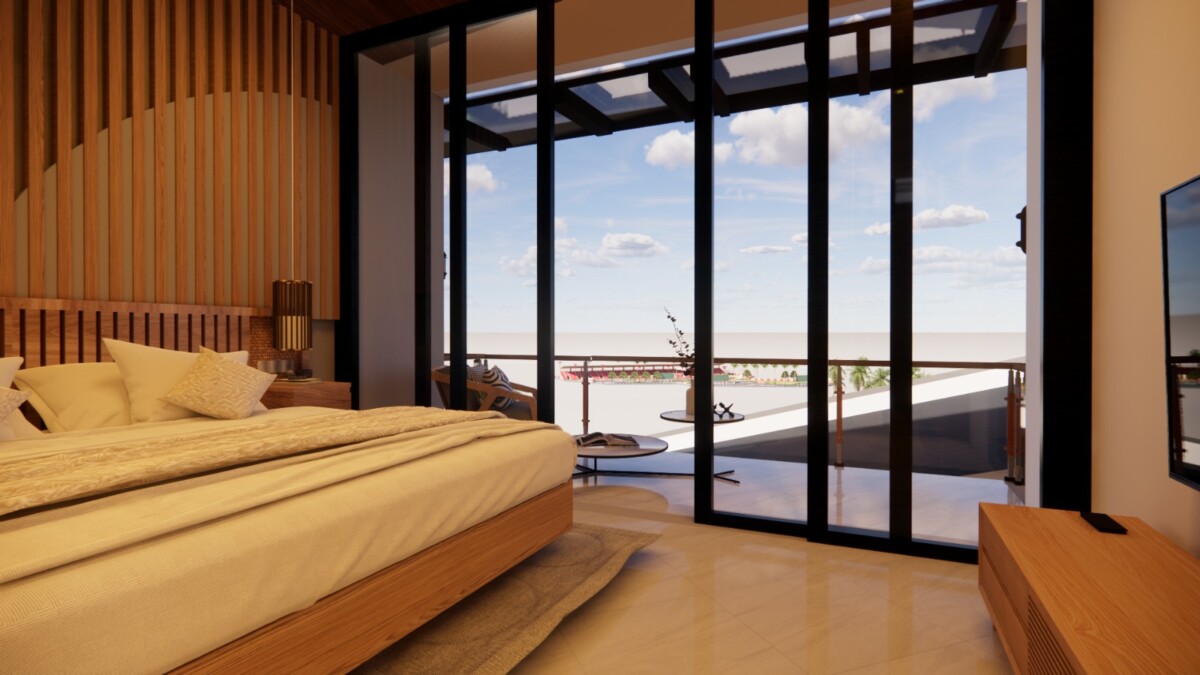 Andrameda menerapkan ciri khasnya melalui modular geometric forms pada fasad dan kombinasi material beton-kayu yang kontras. Fitur bioclimatic design seperti cross-ventilation dan vertical garden menjadikan villa ini nyaman secara alami. Setiap sudut dirancang untuk menikmati panorama sirkuit dan pantai, dengan akses privat yang didukung landscape steps bergaya terasering Lombok.